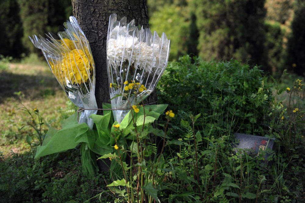 亲友摆放鲜花祭奠在浙江安贤陵园树葬的逝者。新华社记者黄宗治摄